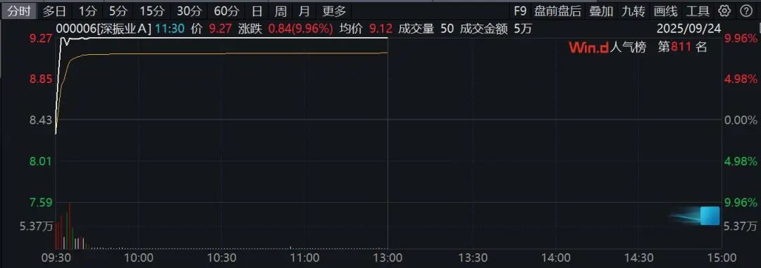 房地产股早间集体走强,板块指数盘初一度放量直线拉升涨逾3%。深振业A开盘仅约2分钟就垂直涨停,股价创年内新高,云南城投、渝开发、上海临港、张江高科等也纷纷直线涨停,并创阶段性新高。