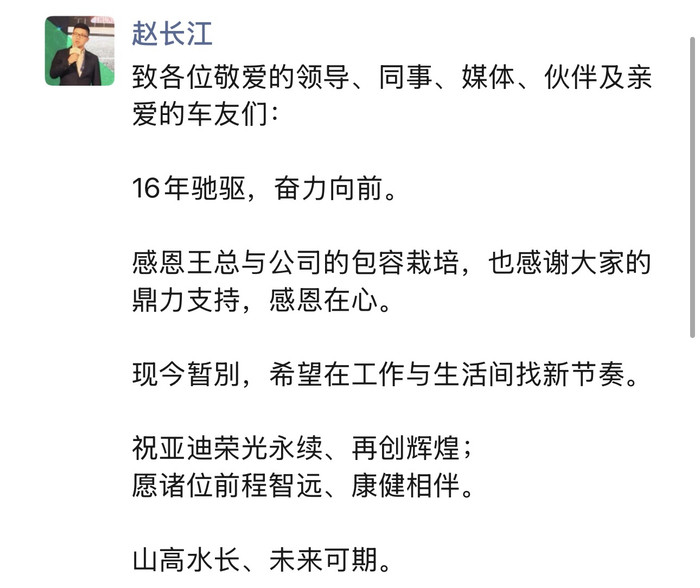[文/观察者网潘昱辰编辑/高莘]10月24日金多多,比亚迪集团腾势方程豹直营事业部总经理赵长江通过朋友圈宣布将离开效力16年的比亚迪。