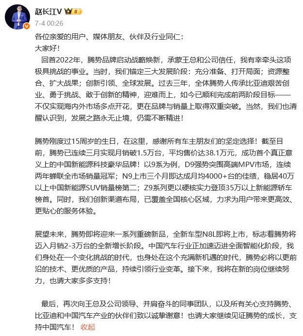 今年7月,赵长江与腾势方程豹直营事业部总经理李慧完成岗位对调。其后赵长江也发布微博称,自己接下来将在新的岗位继续努力。
