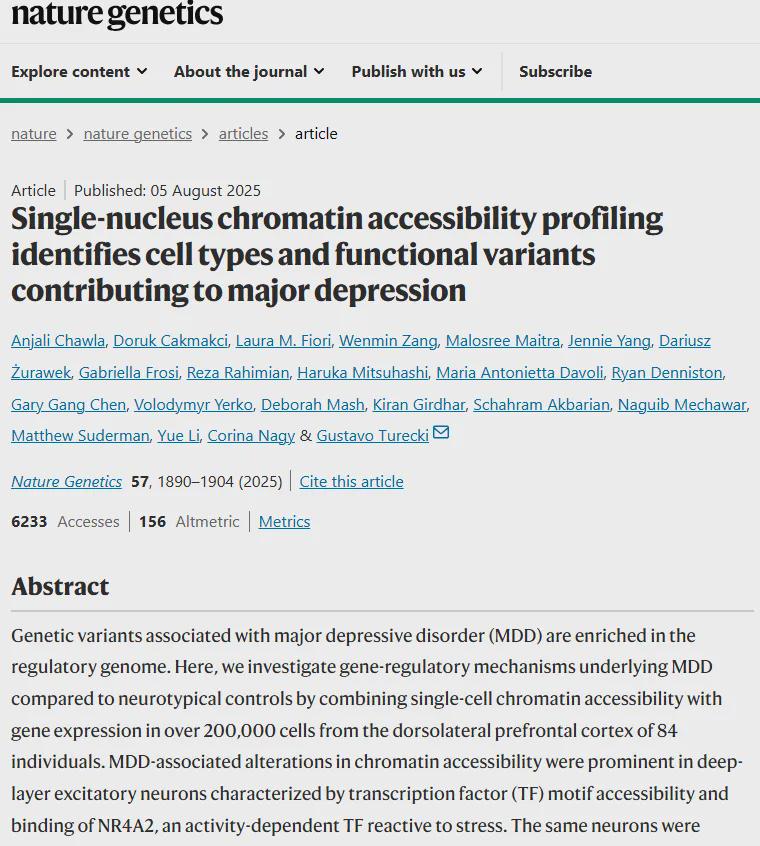 Chawla, A., Turecki, G. et al. Single-nucleus chromatin accessibility profiling identifies cell types and functional variants contributing to major depression.Nature Genetics, 2025; 57 (8): 1890. DOI: 10.1038/s41588-025-02249-4