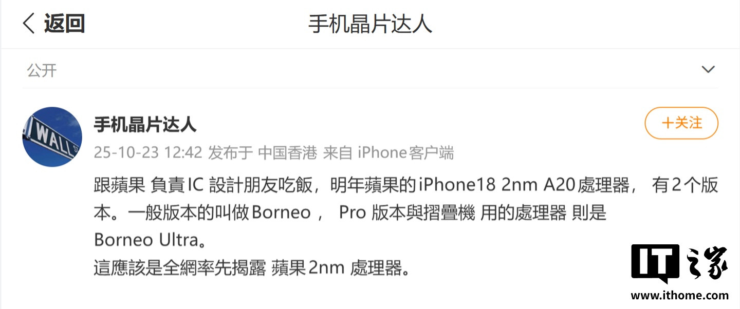 IT之家10月24日消息,@手机晶片达人昨日(10月23日)发布微博,称苹果A20系列将延续双芯片策略安信,分为标准版A20和高性能版A20Pro,而苹果首款折叠iPhone手机预估将装备A20Pro。